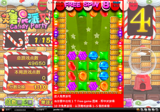 - 游戏在每一层随机派发相应数量的糖果,若有符合游戏规则的糖果组合,即可获得相应的游戏点数,同时,游戏自动生成新的糖果组合,直至不再形成符合游戏规则的糖果组合。